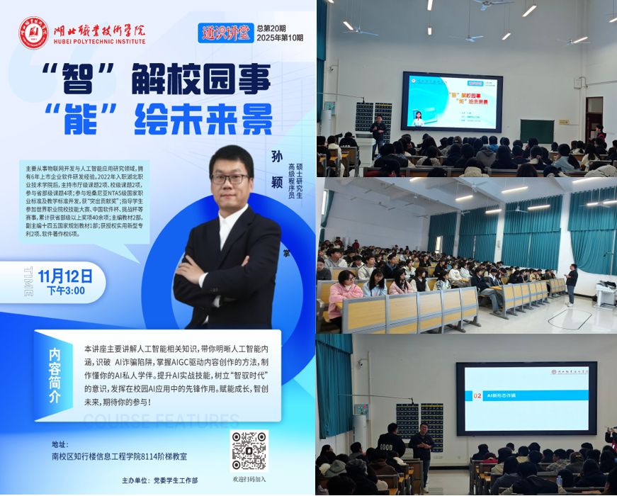 11月12日,第20期通識(shí)講堂在南校區(qū)知行樓8114階梯教室開(kāi)講。高級(jí)程序員、信息工程學(xué)院孫穎老師以《“智”解校園事,“能”繪未來(lái)景》為主題,為兩百余名學(xué)子帶來(lái)一場(chǎng)關(guān)于AI應(yīng)用與創(chuàng)新的深度分享。