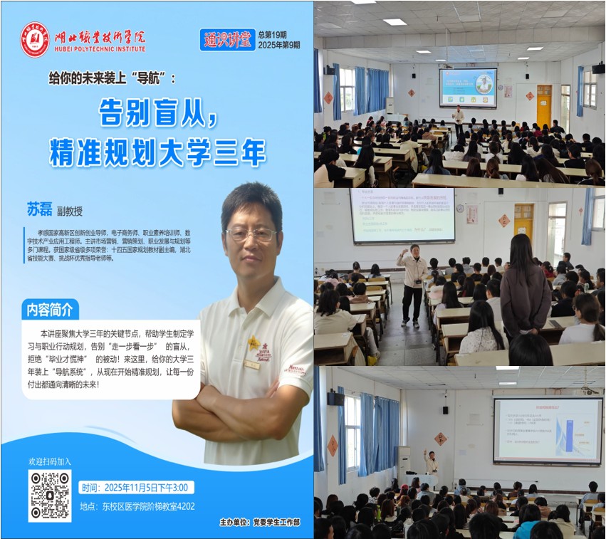 11月5日,第19期通識(shí)講堂在東校區(qū)開(kāi)講。孝感國(guó)家高新區(qū)創(chuàng)新創(chuàng)業(yè)導(dǎo)師、財(cái)經(jīng)與旅游學(xué)院副教授蘇磊老師以《為未來(lái)裝上“導(dǎo)航”:告別盲從,精準(zhǔn)規(guī)劃大學(xué)三年》為主題,為學(xué)子們科學(xué)規(guī)劃學(xué)業(yè)與職業(yè)發(fā)展指點(diǎn)迷津。蘇磊老師以“導(dǎo)航系統(tǒng)”為喻,緊扣高職學(xué)生學(xué)習(xí)特點(diǎn)與就業(yè)趨勢(shì),系統(tǒng)解析大學(xué)三年各階段關(guān)鍵任務(wù),勾勒清晰的“時(shí)間坐標(biāo)軸”,并強(qiáng)調(diào)“規(guī)劃不是一成不變的‘死計(jì)劃’,應(yīng)如導(dǎo)航般根據(jù)路況靈活調(diào)整,其前提是目標(biāo)明確。”其生動(dòng)的闡釋與實(shí)用的建議,為同學(xué)們擺脫“畢業(yè)即慌亂”的困境提供了有效方法。