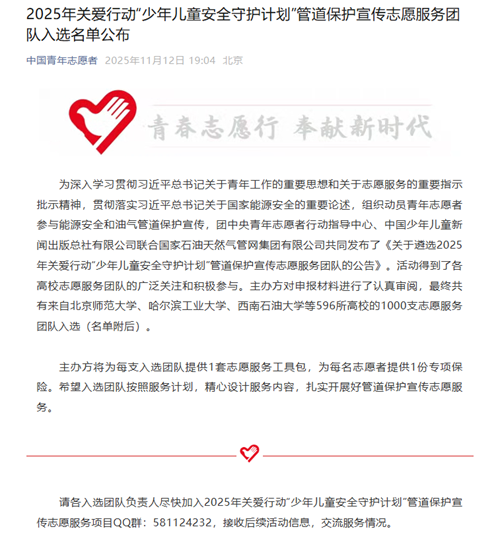 (本網(wǎng)訊 蔡思政)近日,團中央青年志愿者行動指導中心等單位聯(lián)合公布了2025年關愛行動“少年兒童安全守護計劃”管道保護宣傳志愿服務團隊入選名單,湖北職院財經(jīng)與旅游學院“鋒”華正茂志愿服務隊憑借扎實的志愿服務基礎與精心設計的項目方案,從眾多團隊中脫穎而出,成功入圍。